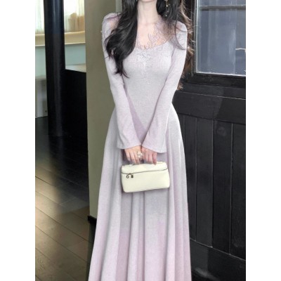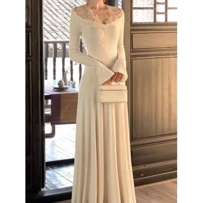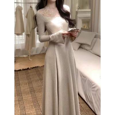 首页 > 男装 / 女装 / 内衣 > 女装 > 连衣裙 > 【不知雪】温柔氛围感蕾丝v领针织连衣裙收腰显瘦a摆长裙