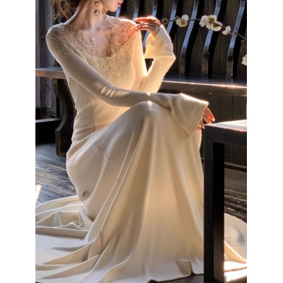 首页 > 男装 / 女装 / 内衣 > 女装 > 连衣裙 > 【不知雪】温柔氛围感蕾丝v领针织连衣裙收腰显瘦a摆长裙